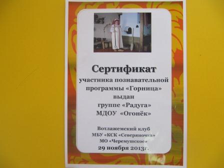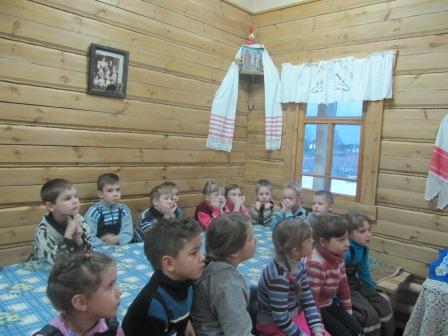 В конце ноября наша группа « Радуга» отправилась в очередное путешествие. Снарядившись рюкзаками, а там все необходимое для юного туриста, мы отправились в деревню Вотлажма. Приехав на место, нас встретила хозяйка русской избы. Она рассказала познавательную истории о Вотлажемском городище. Городищи-так назывались древние поселения. Также мы совершили экскурсию по экспозиции «Уголок северной избы». Хозяйка нам объяснила, что такое красный угол в русской избе и мы узнали, что напротив красного угла располагается печной, или бабий, угол [кут]. Здесь женщины готовили пищу, пряли, ткали, шили и т. д. Наши девочки попробовали там потрудиться. Хозяюшка загадывала загадки про домашнюю утварь – ответы –подсказки мы находили в избе. Поиграли в игры для добрых молодцев и в хороводные русские народные игры. По окончанию экскурсии нам вручили сертификат участника познавательной программы « Горница». Мы очень интересно провели время, познакомились с предметами русского народного быта и обычаями, существовавшими в старину. Старое уходит, но его нужно знать и беречь.