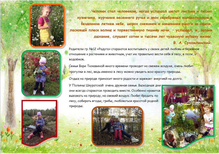 В нашей группе № 12 « Радуга» каждый год проходит фотовыставка « Семейный отдых летом». Наши родители активно принимают участие в выставке. И в этом году своим опытом хотят поделиться семьи: Попова Саши и Шевченко Ильи.