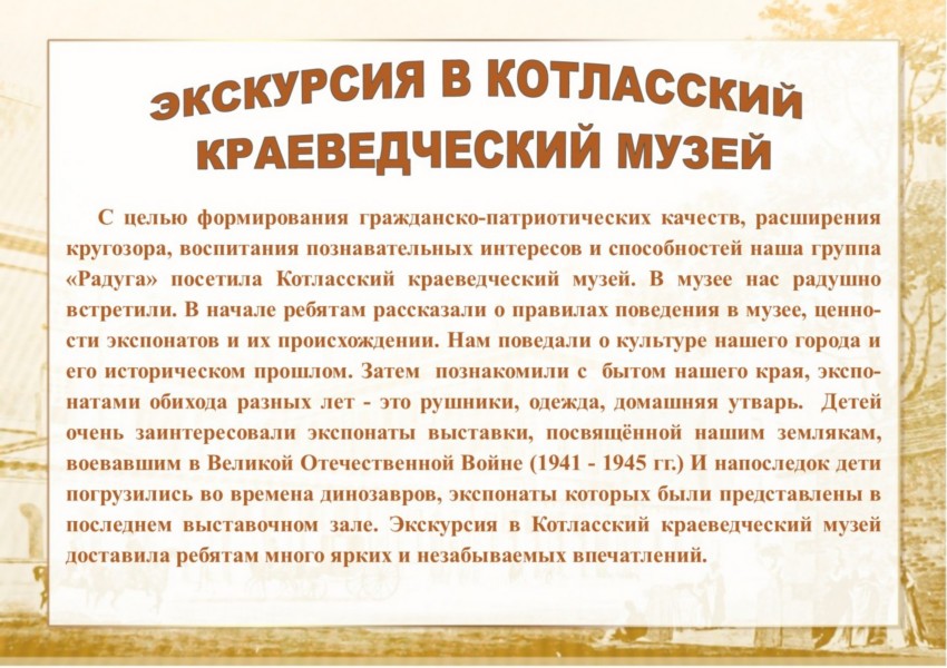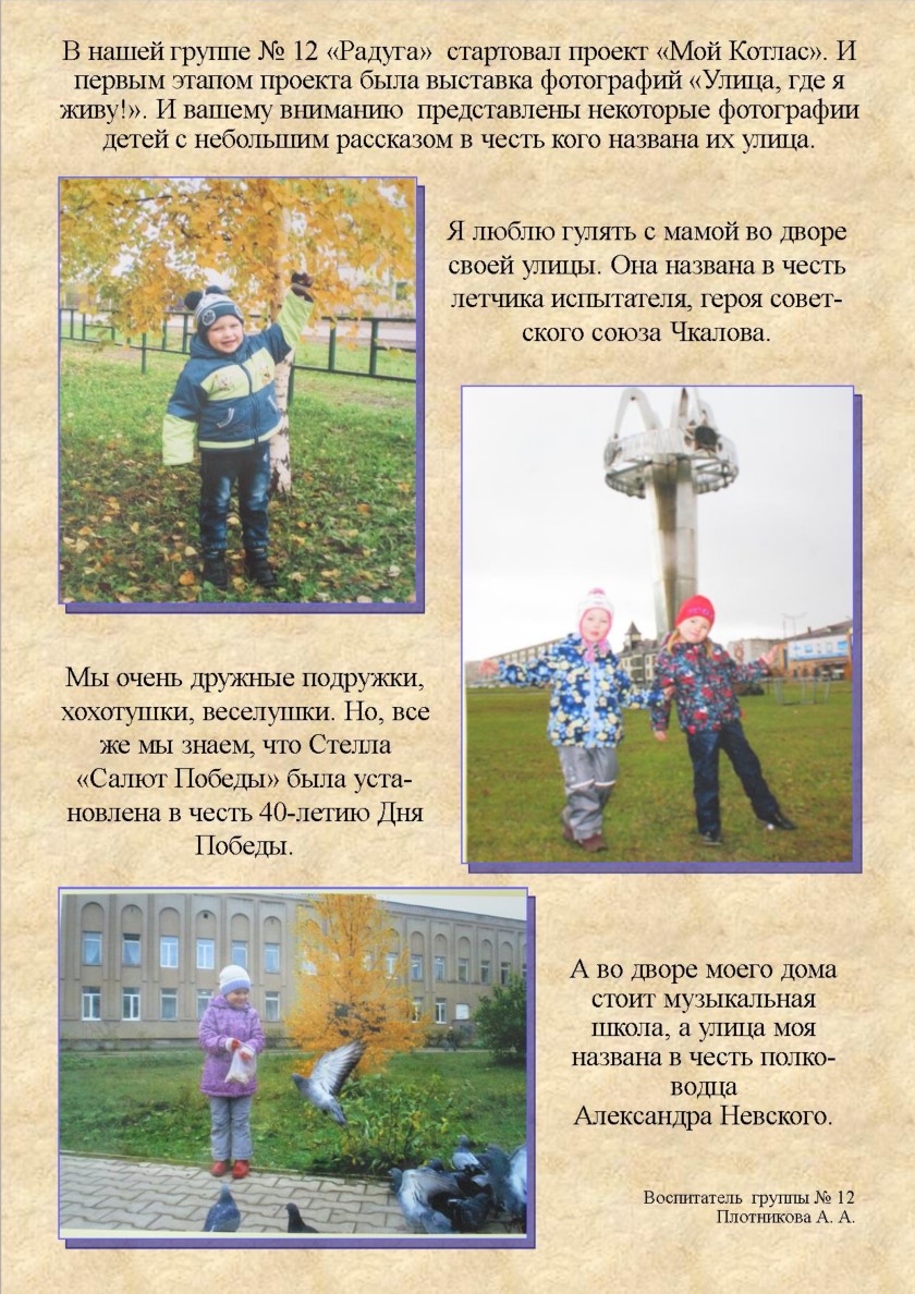 С 4- 8 ноября в нашем детском саду прошла тематическая неделя «Мой город». Дети гр.№ 12 « Радуга» совершили обзорную экскурсию по нашему городу Котласу. Тема экскурсии «О чем расскажет старая фотография». Проводила ее Николаева Наталья Ивановна - зав. отделом Котласского краеведческого музея.