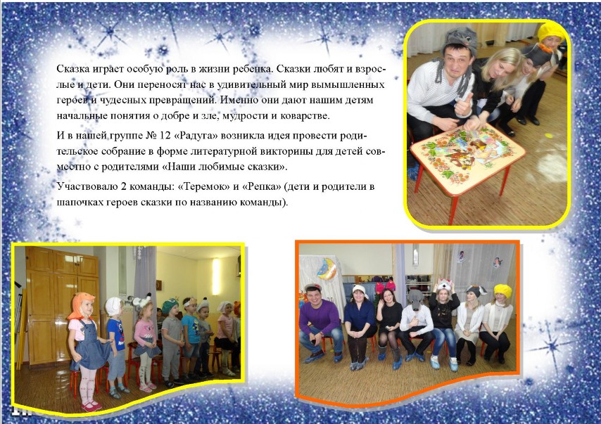 6 февраля в группе № 12 прошло родительское собрание в форме игры КВН с участием детей. Родители и дети поделились на 2 команды: команда детей - «Весёлые », команда родителей - «Находчивые ».В начале игры была проведена «Разминка» - «Шуточная викторина! ». Все участники быстро справились с заданием. Также были проведены и такие конкурсы, как конкурс скороговорок, «Закончи пословицу!», «Живые числа!», «Составь слово из слогов! » «Преврати геометрическую фигуру во что- нибудь интересное! », были заданы вопросы на смекалку.